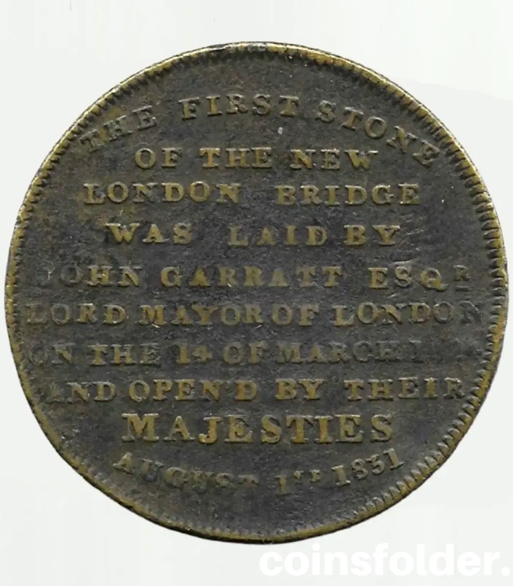 The reverse features a central inscription arranged in ten lines, with the top and bottom lines gracefully curved. The text records that the first stone of the New London Bridge was laid by John Garratt, Esq., Lord Mayor of London, and that the bridge was opened by Their Majesties on August 1st, 1831. However, the medal incorrectly states the laying date as March 14, 1824, rather than the generally accepted date of June 15, 1825. Despite this error, the inscription adds historical intrigue and authenticity to the piece.