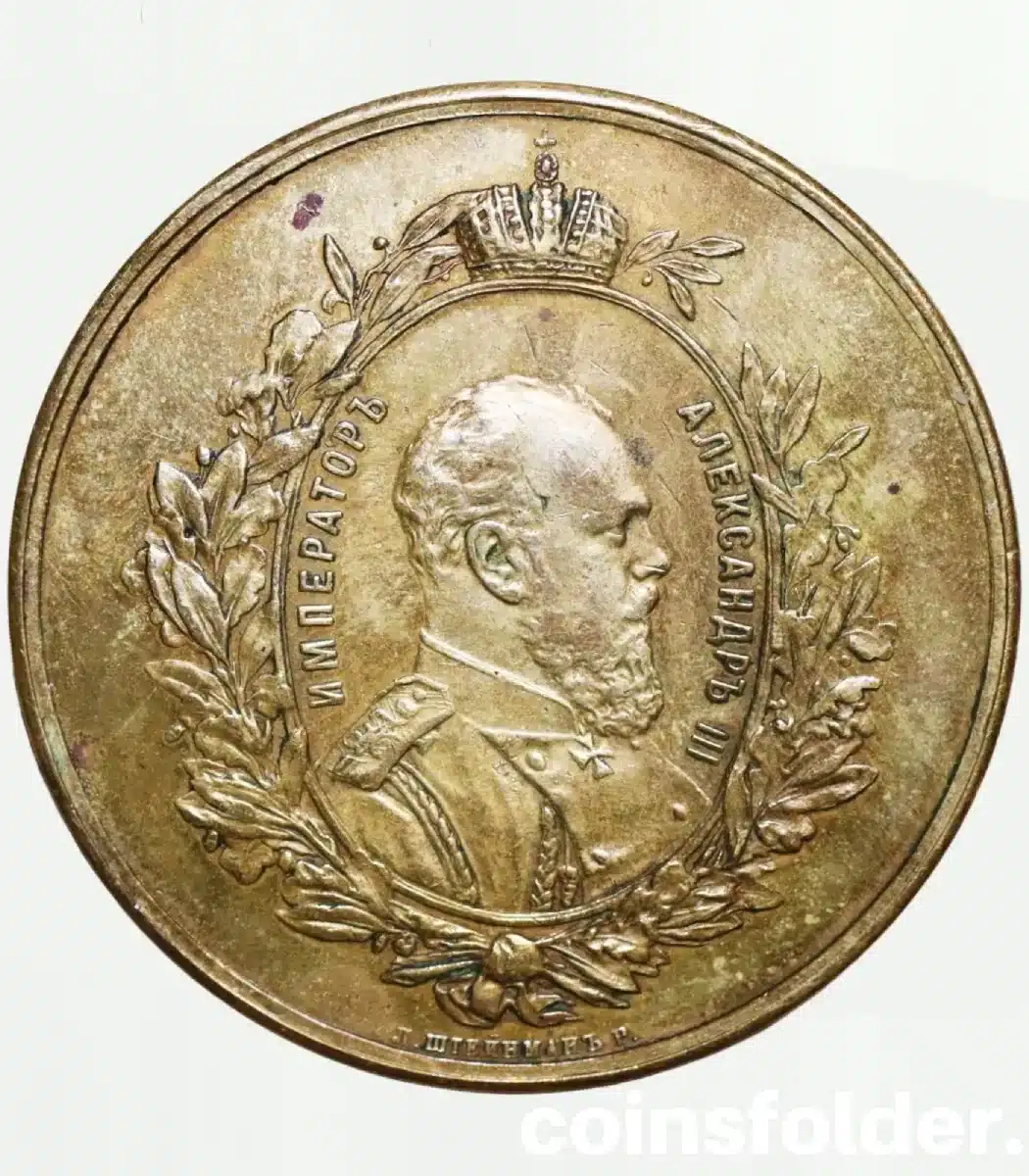 On the obverse, the medal presents a dignified portrait of Emperor Alexander III, rendered with strong realism and authority. The surrounding inscription reads “ИМПЕРАТОРЪ АЛЕКСАНДРЪ III”, clearly identifying the ruler. Below the portrait appears the signature “Л. ШТЕЙНМАНЪ Р.”, crediting engraver Leopold Steinman. As a result, the obverse combines imperial symbolism with refined medallic artistry. Moreover, the portrait conveys stability and strength, qualities closely associated with Alexander III’s reign.