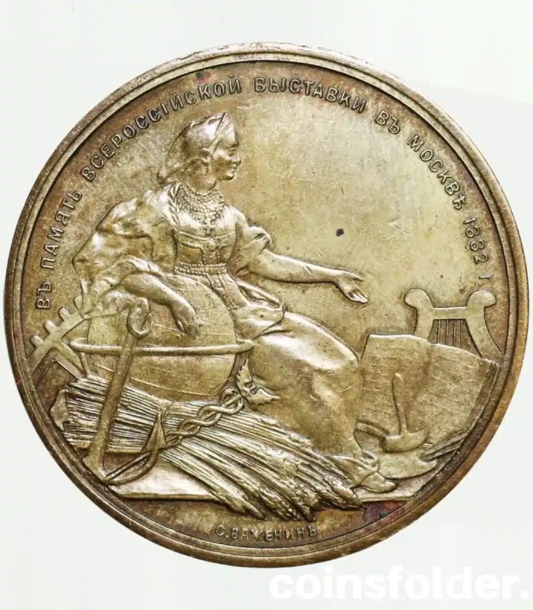 The reverse explicitly commemorates the historic event with the inscription “ВЪ ПАМЯТЬ ВСЕРОССIЙСКОЙ ВЫСТАВКИ ВЪ МОСКВЕ 1882 Г.”, which translates to “In memory of the all-Russian exhibition of 1882 in Moscow.” Beneath the text appears “С. ВАЖЕНИНЪ”, identifying engraver Sergey Vazhenin. Consequently, the reverse serves not only as documentation of the event but also as a celebration of Russian industrial and cultural progress.