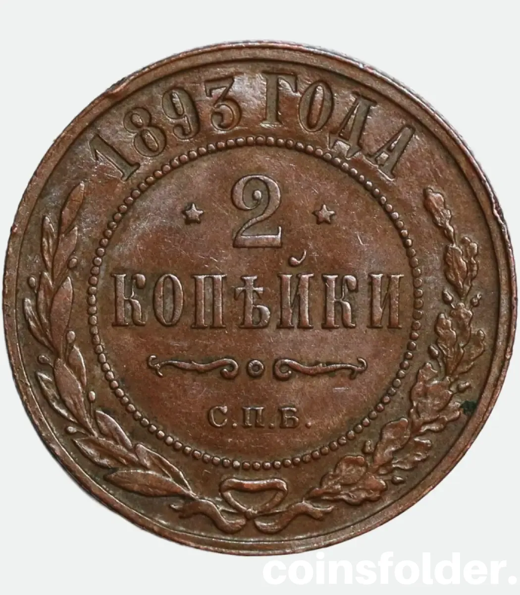 On the obverse, the coin features the crowned Imperial Russian double-headed eagle, symbolizing the unity of church and state under the Tsar’s authority. The reverse displays the denomination “2 Kopecks,” the year 1893, and the mint mark identifying the St. Petersburg Mint, which produced much of the empire’s circulation coinage at the time.