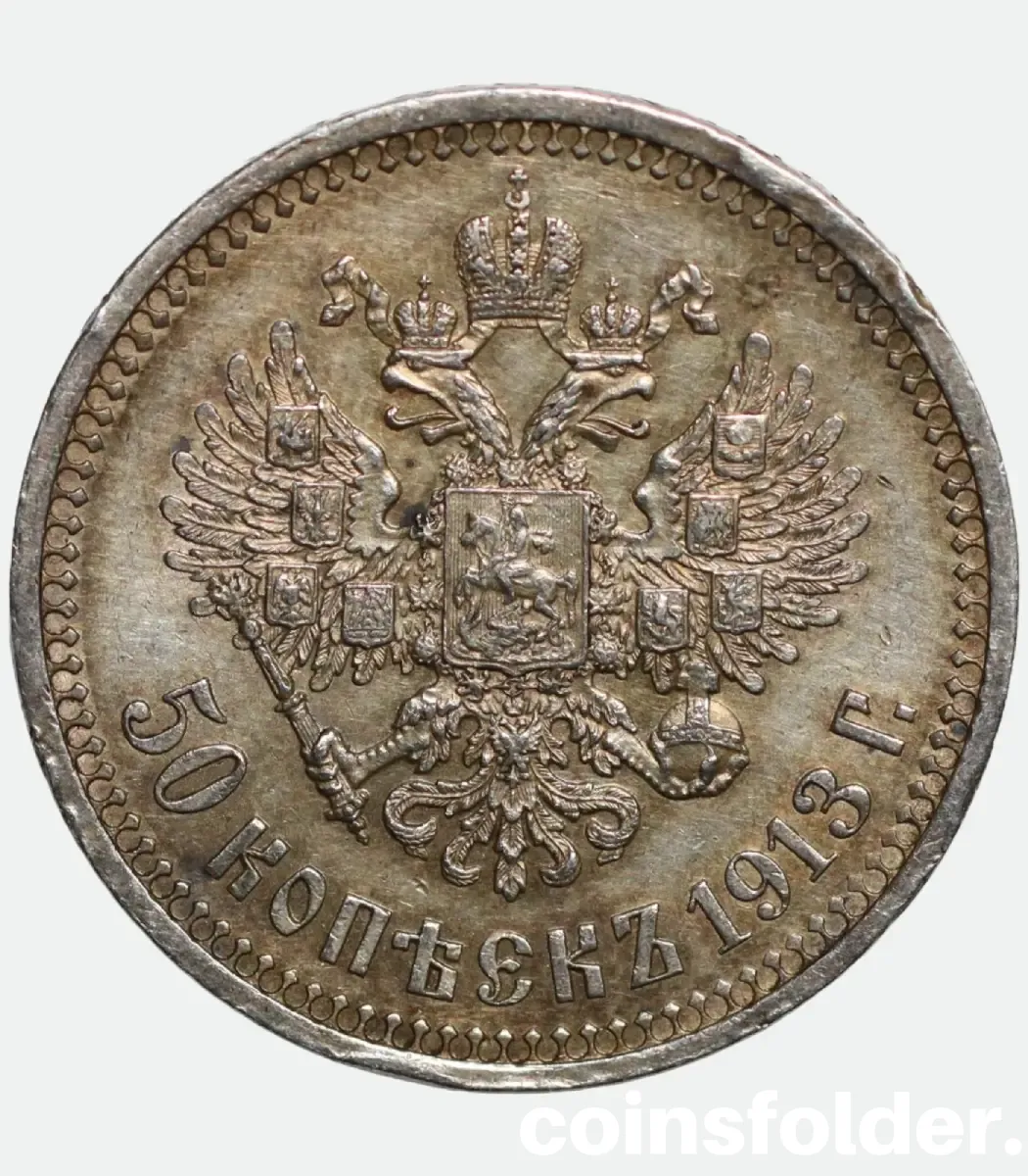 The 1913 Russian 50 Kopecks (ВС) coin is a magnificent silver issue from the reign of Nicholas II, the last Emperor of Russia. Struck in .900 fine silver at the St. Petersburg Mint, this coin reflects the refined artistry and enduring prestige of Imperial Russian coinage before the fall of the monarchy.