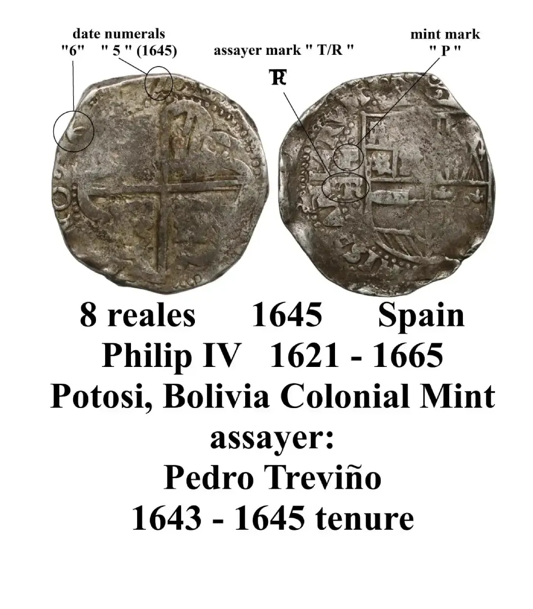 The date attribution to 1645 is confirmed by visible numerals — the “6” and the lower portion of the “5” remain in their correct positions. Equally important is the assayer’s mark “T over R”, identifying Pedro Treviño, who served at the Potosí mint from 1643 to 1647. Above the assayer’s mark appears the bold mintmark “P”, further verifying its origin.