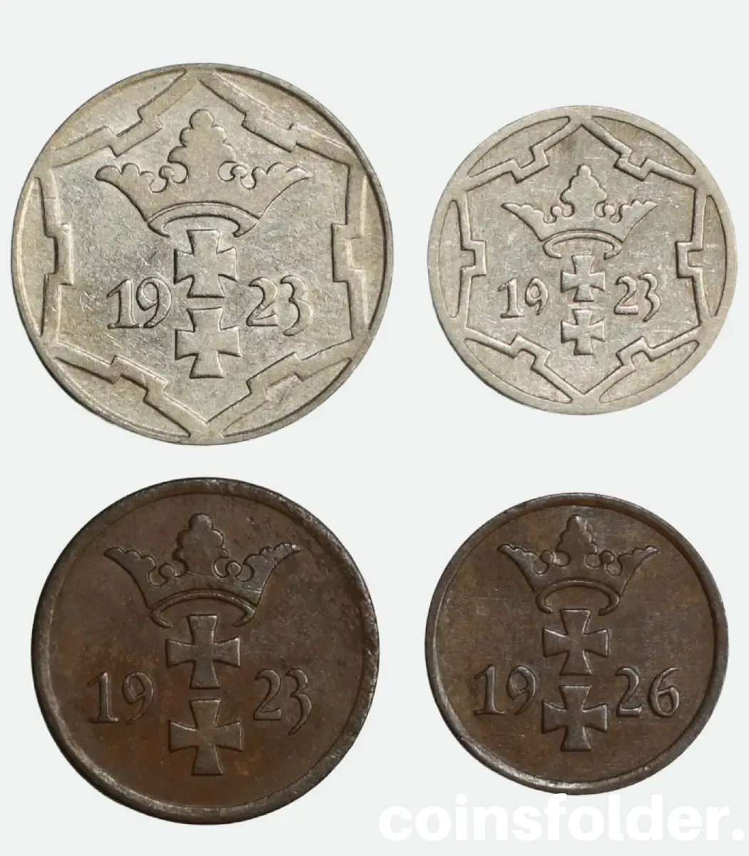 This set of 4 coins from the Free City of Danzig includes denominations of 10, 5, 2, and 1 Pfennige, representing a fascinating glimpse into the interwar numismatic history of Danzig. Minted between 1923 and 1926, these coins capture the unique monetary identity of the semi-autonomous Free City of Danzig, established under the League of Nations after World War I.