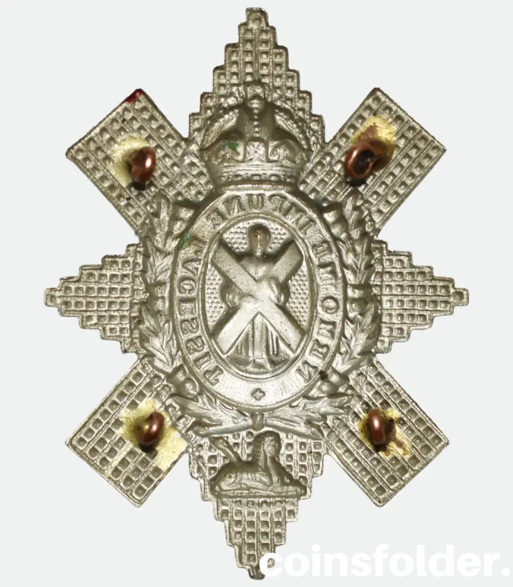 The badge displays the intricate wreath and thistle details typical of wartime Black Watch insignia, and the reverse includes original WWII-period lugs and mounting points, confirming its authenticity. These characteristics make it highly desirable among collectors specializing in Scottish regiments, World War II militaria, or British Army cap badges.