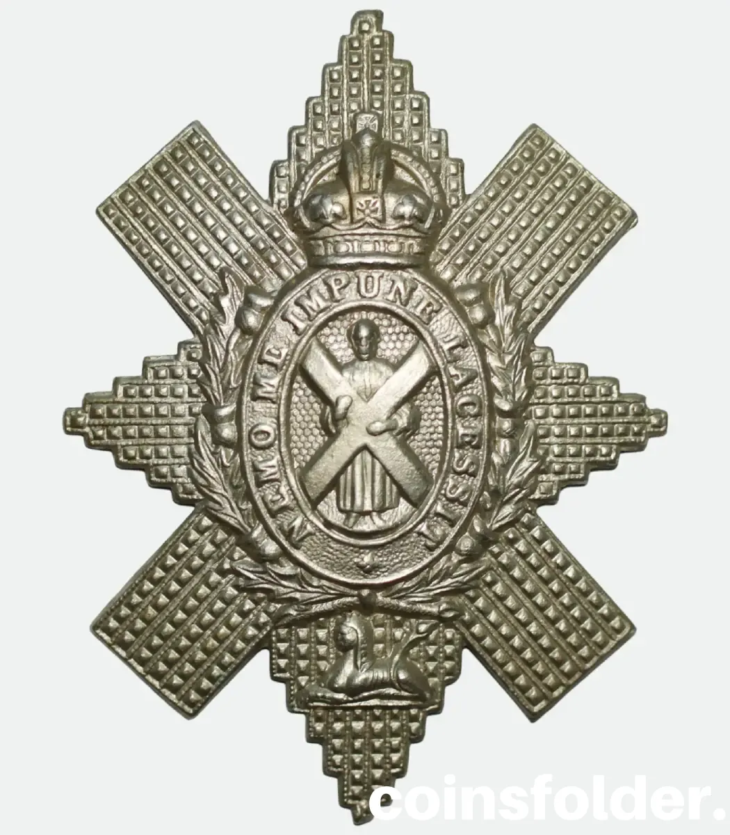 This original WWII-era cap badge of The Black Watch (Royal Highlanders) represents one of the most storied and respected regiments in Scottish and British military history. Crafted in metal with exceptional detail, it features the regiment’s classic star-shaped badge with a textured backdrop, crowned at the top and centered by the figure of St. Andrew holding the saltire cross—the national symbol of Scotland. Surrounding the central medallion is the famed regimental motto, “Nemo Me Impune Lacessit” (“No one provokes me with impunity”), a proud declaration closely associated with Scottish heritage and military tradition.